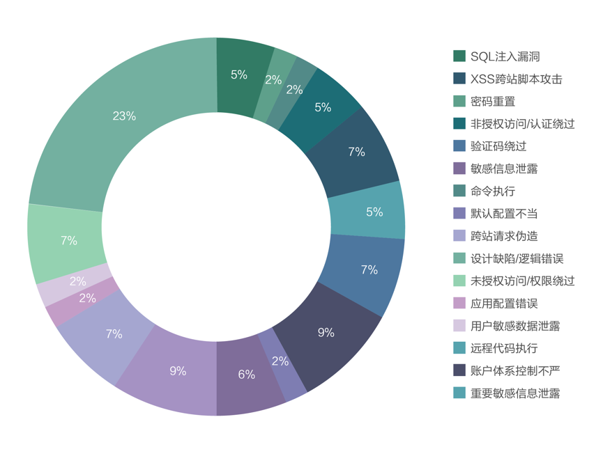 绕过认证登录等,其中业务逻辑漏洞所占比例最大,如图