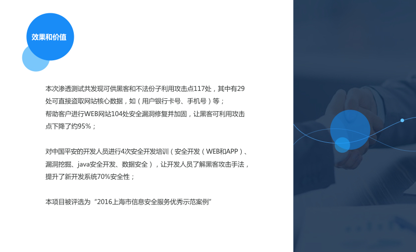 完整的安全培训课程为企业做针对性安全培训来加强企业自身开发人员的安全意识,这样大大减少WEB和APP端所带来的安全漏洞。