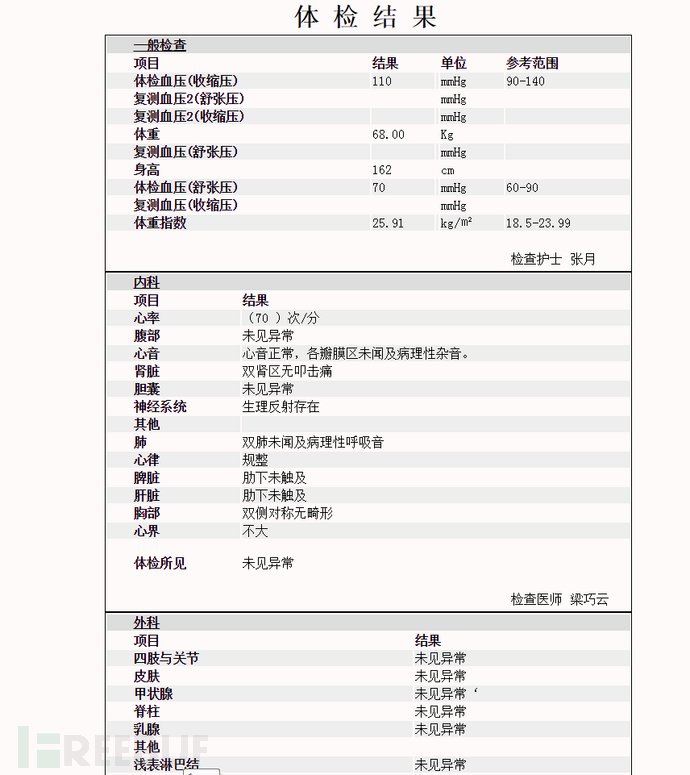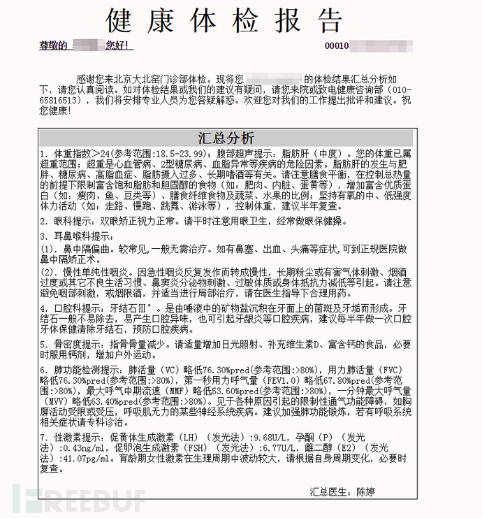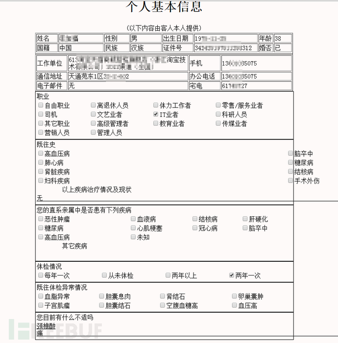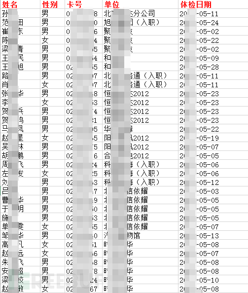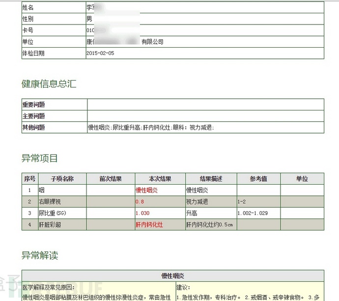体检平台一般会记录用户的体检信息,姓名,联系电话,生日,身份证号码等各种信息的泄露对个人隐私造成威胁 也可能会被某些从事药品推销的人员盯上,体检平台的信息安全不容忽视!而此体检平台涵盖了:保险,证券,金融 各种事业单位、企业单位等全国范围的人员体检信息。