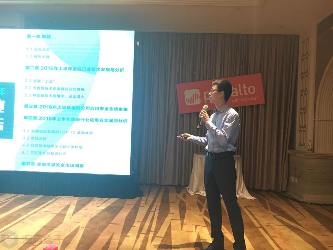 漏洞盒子安全顾问陆柏廷在会议上发表题为《以攻击者视角完善企业防御体系》的精彩演讲。陆柏廷指出,攻防体系的不对称导致企业防御存在脆弱性。他援引FreeBuf和漏洞盒子的漏洞案例说明如今网络攻击者的目标明确、复杂且多变,并通过《2016上半年金融公司应用安全态势报告》(FreeBuf出品)展示了应用安全以及安全漏洞态势的脆弱性。
