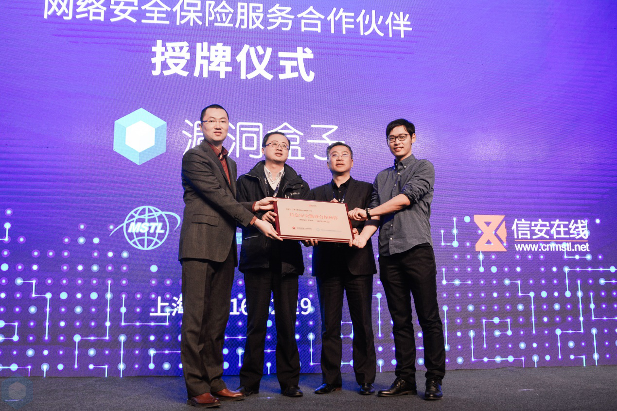 会议期间还进行了网络安全保险合作伙伴的授牌仪式:斗象科技成为提供安全服务的首家合作单位,上海斗象信息科技有限公司联合创始人, COO谢忱作为斗象科技的代表参与此次授牌仪式,公安部第三研究所、公安部信息安全产品检测中心、国家网络与信息系统安全产品质量监督检验中心检测部主任陆臻先生, 安信农业保险股份有限公司上海宝山支公司总经理助理张勇先生,上海嘉韦思信息技术有限公司CEO舒首衡先生一起在台上见证了此次授牌仪式。