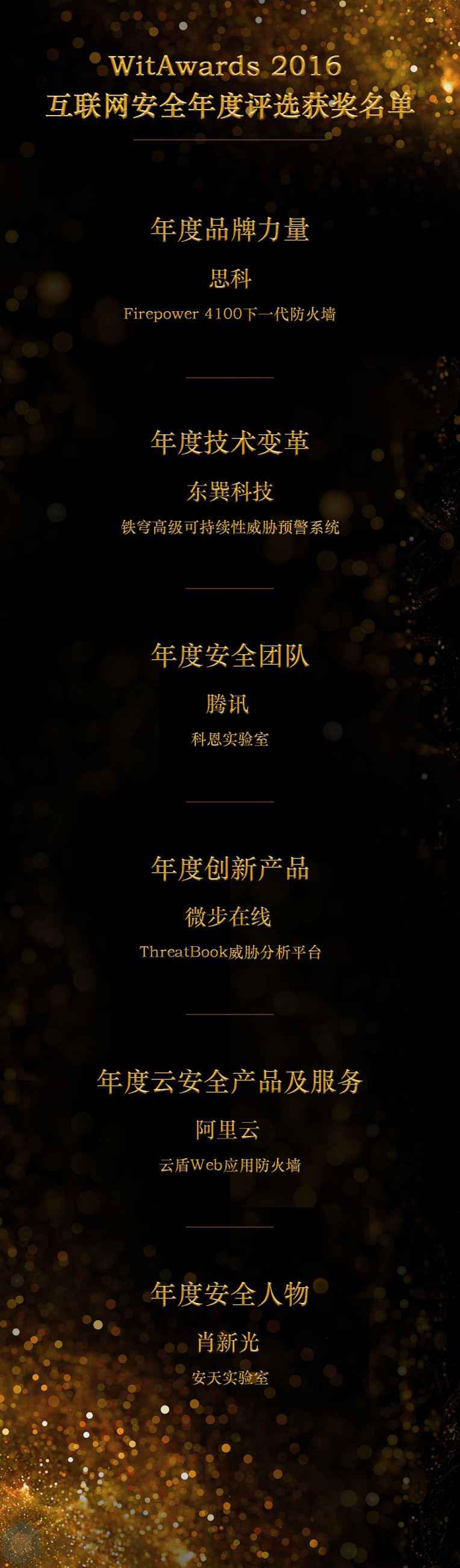 最终6个获奖项目分别是年度品牌力量:思科Firepower 4100下一代防火墙、年度技术变革:东巽科技铁穹高级可持续性威胁预警系统、年度安全团队:腾讯科恩实验室、年度创新产品:微步在线ThreatBook威胁分析平台、年度安全云产品及服务:阿里云云盾Web应用防火墙、年度安全人物:安天实验室肖新光。